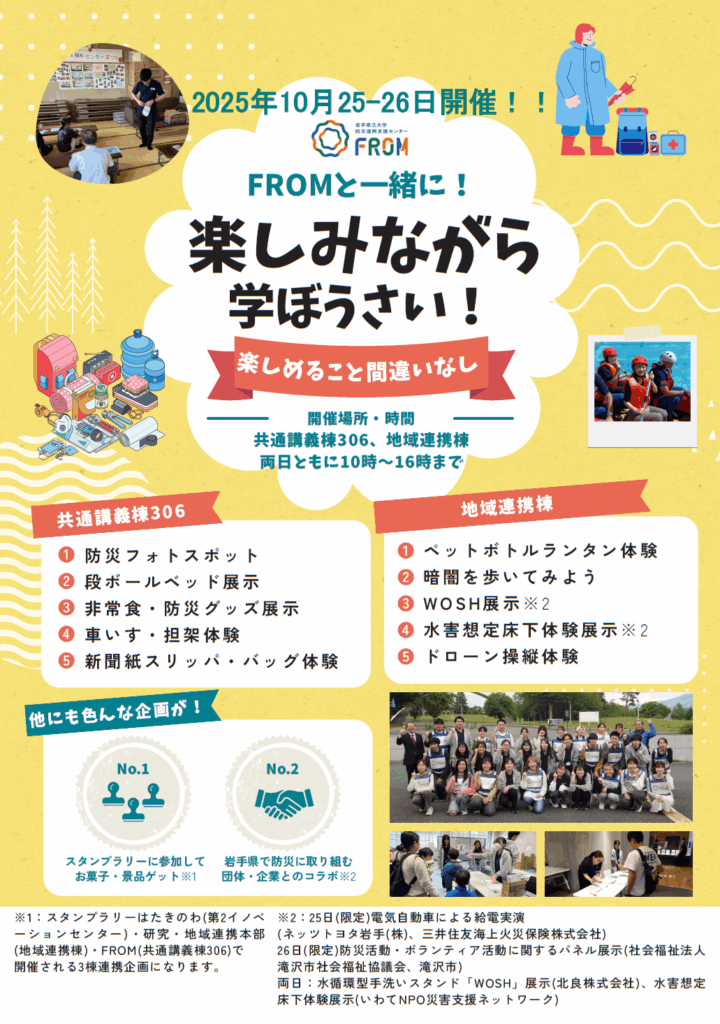 岩手県立大学防災復興支援センターでは、地域連携棟を主会場に、学生団体FROMの他、地域の防災力向上に取り組むさまざまな団体・企業の皆様と連携した防災ワークショップ企画「楽しみながら学ぼうさい!!」を開催します。
